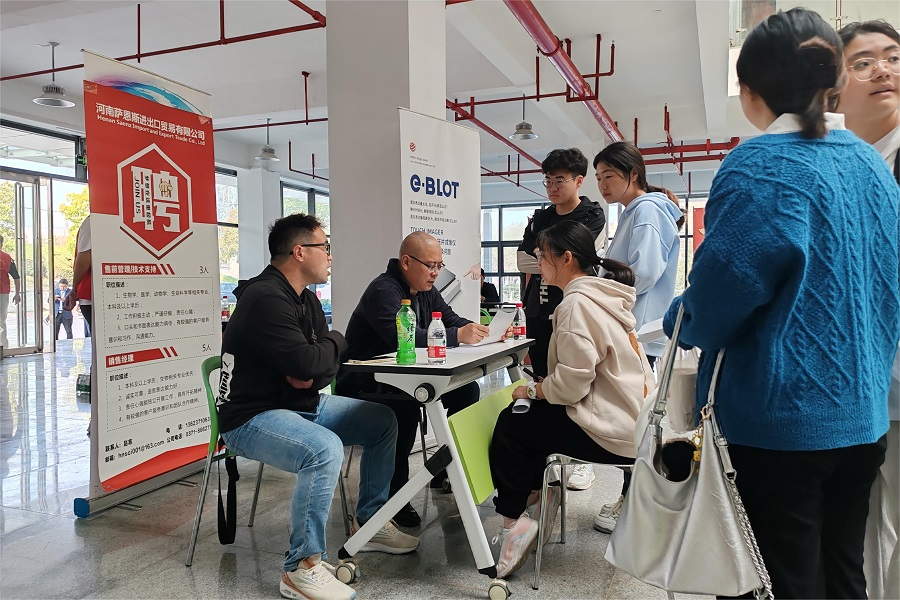 本次双选会共邀请了美森药业、吉因加(北京)科技有限公司、驻马店华中正大有限公司等省内外27家企业,300余个岗位涵盖生物技术、生物工程、生物制药等专业。同学们手持简历穿梭于各招聘单位之间,了解企业的基本情况、招聘岗位及招聘要求,并就工作内容、薪资待遇、未来发展等方面与用人单位进行了深入交流。