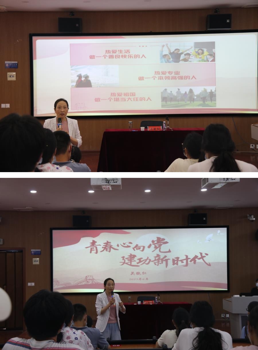 吴晓红以《青春心向党,建功新时代》为题,紧紧围绕学习贯彻习近平新时代中国特色社会主义思想主题教育的总要求,紧密结合国内外形势,通过详实的数据和生动的案例,从“热爱生活,做一个善良快乐的人”、“热爱专业,做一个本领高强的人”、“热爱祖国,做一个堪当大任的人”三个维度,教育引导师生深刻领悟开展主题教育的重大意义,全面把握“学思想、强党性、重实践、建新功”的总要求,聚焦根本任务,紧盯具体目标,着力解决实际问题,努力做到以学铸魂,以学增智,以学正风,以学促干。