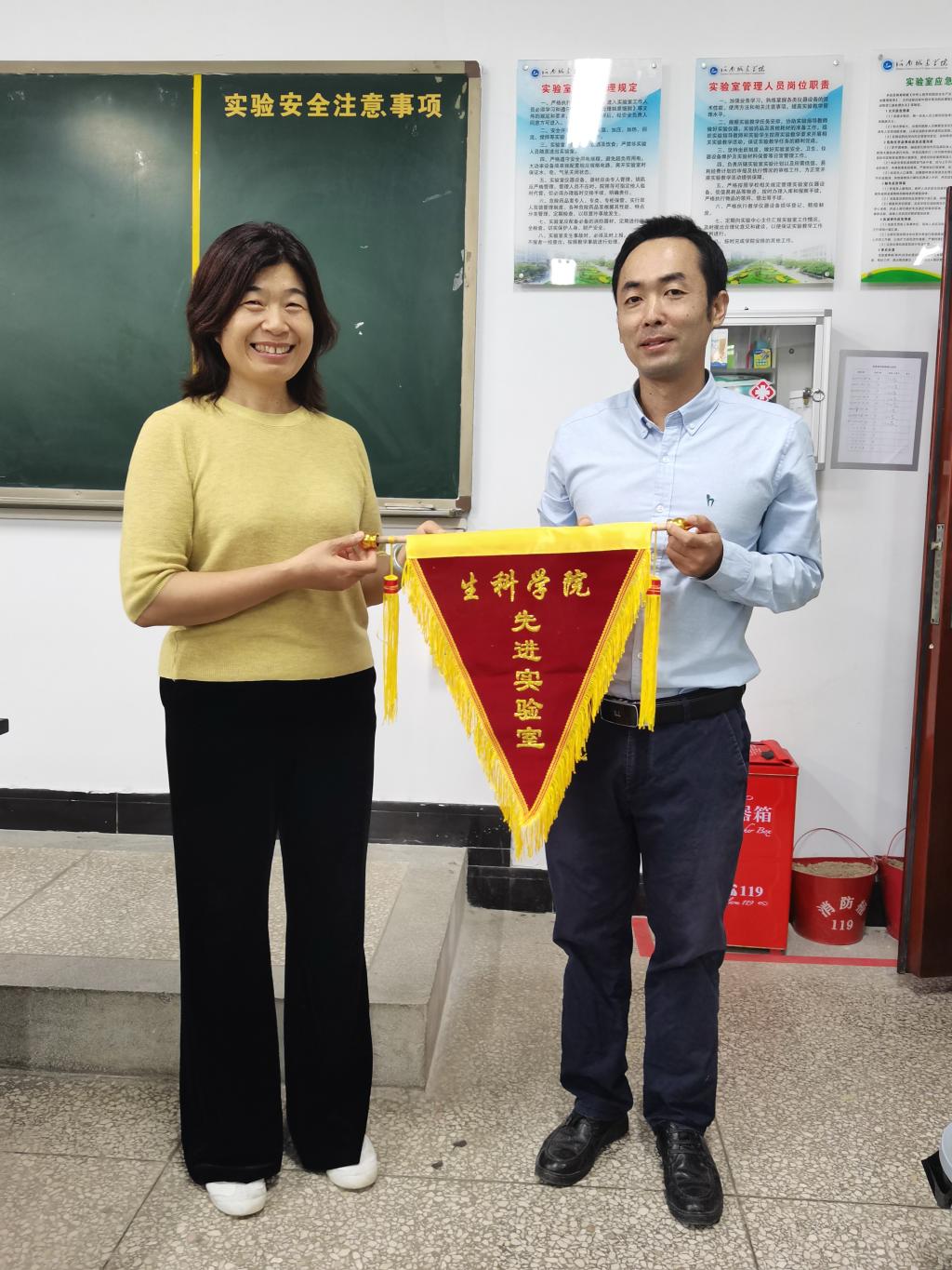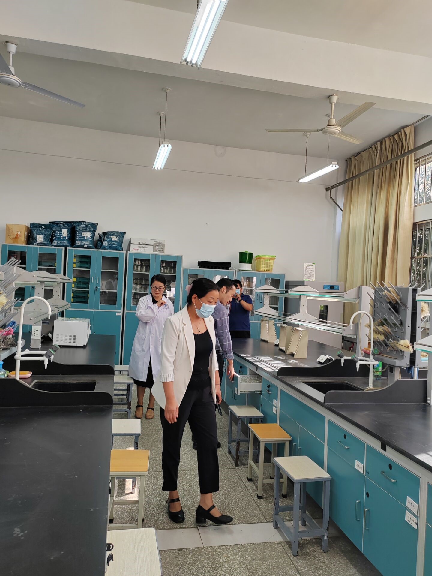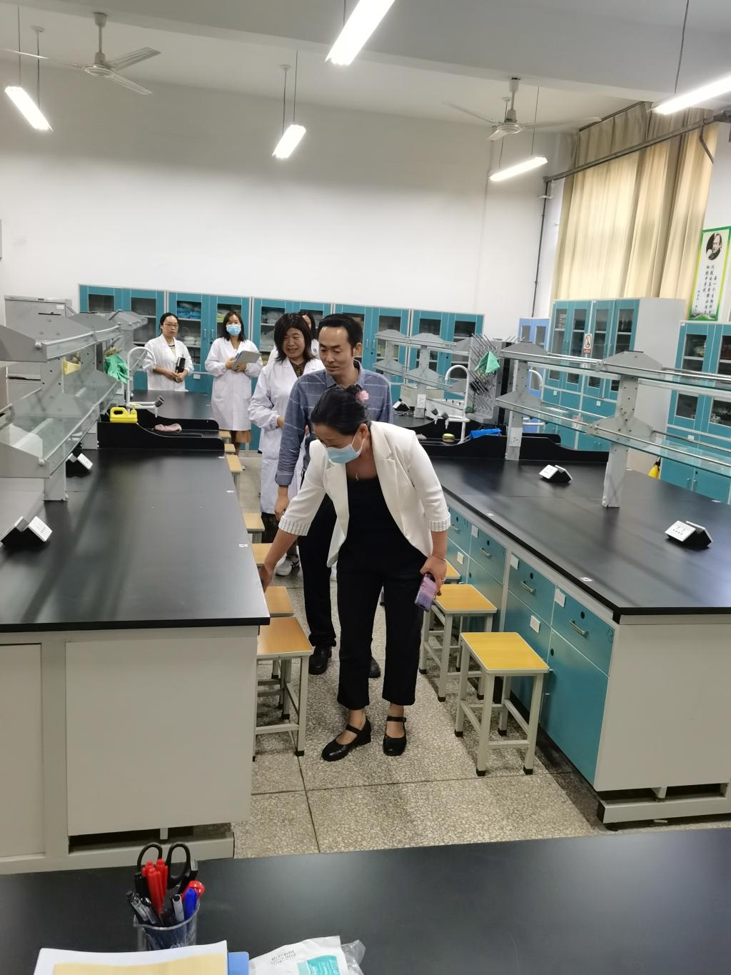 检查组一行分别对各实验室的消防安全、水电安全、化学试剂保管、仪器设备维护保养以及实验台面、地面整洁情况等方面进行了全面细致的评比检查。参评实验室环境均整洁美观,特别是方改霞副教授负责的普通生物学实验室管理较好、仪器物品摆放规整、台面干净,被评为先进实验室。