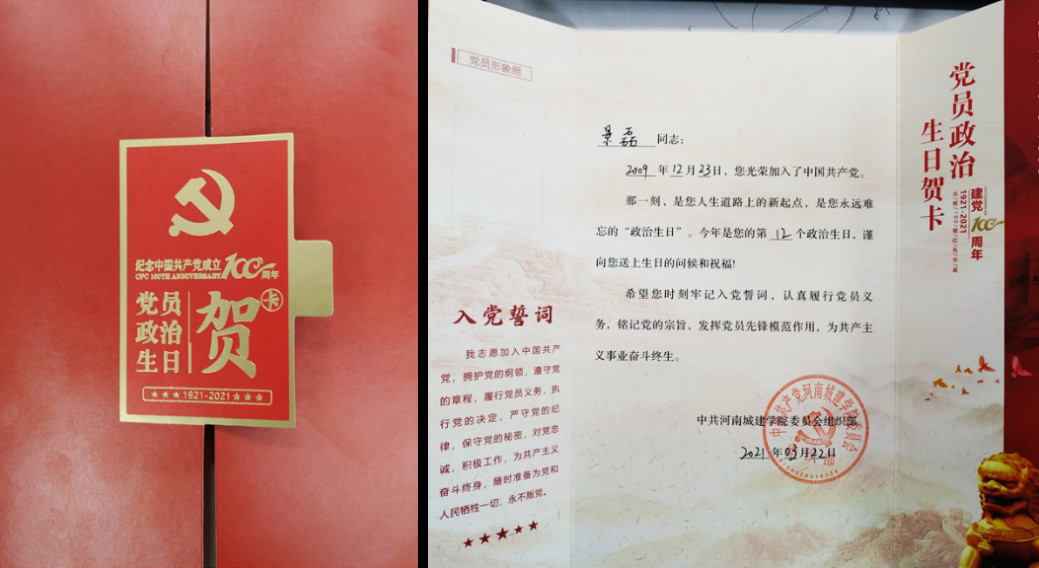 会上,宣传委员景磊带领全体教师学习了中国共产党成立的简史,了解了中国共产党创建的艰难,更了解了诸多为了党的建设事业而涌现出来的革命先烈,他们那种为真理而无私大公的精神值得我们传承并加以发扬。全体党员重温入党誓词,忆初心、谈感言,追忆党的光辉历程,讴歌党的丰功伟绩。在《把一切献给党》的旋律中,支部书记范燕茹为党员同志发放《党员政治生日贺卡》,庆祝政治生日,共同追忆入党时激情澎湃的岁月,回首入党时的誓言与初心,更加坚定了甘愿为党的事业奉献青春和生命的信念。