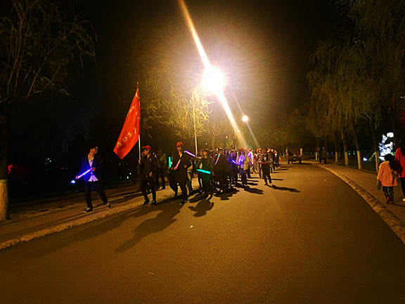 26日晚六点半一百多名志愿者在南门集合,在组织者的带领下来到平西湖公园,夜幕降临,志愿者们开始了“荧光夜跑”活动。志愿者们手持大型荧光棒,排着排着的队伍,其中还有脚踏轮滑鞋的同学们,奔跑在平西湖公园的环湖道路上。本次活动受到了广大市民的一致好评,许多在平西湖公园游玩的市民见到后都纷纷积极加入“夜跑”队伍之中。