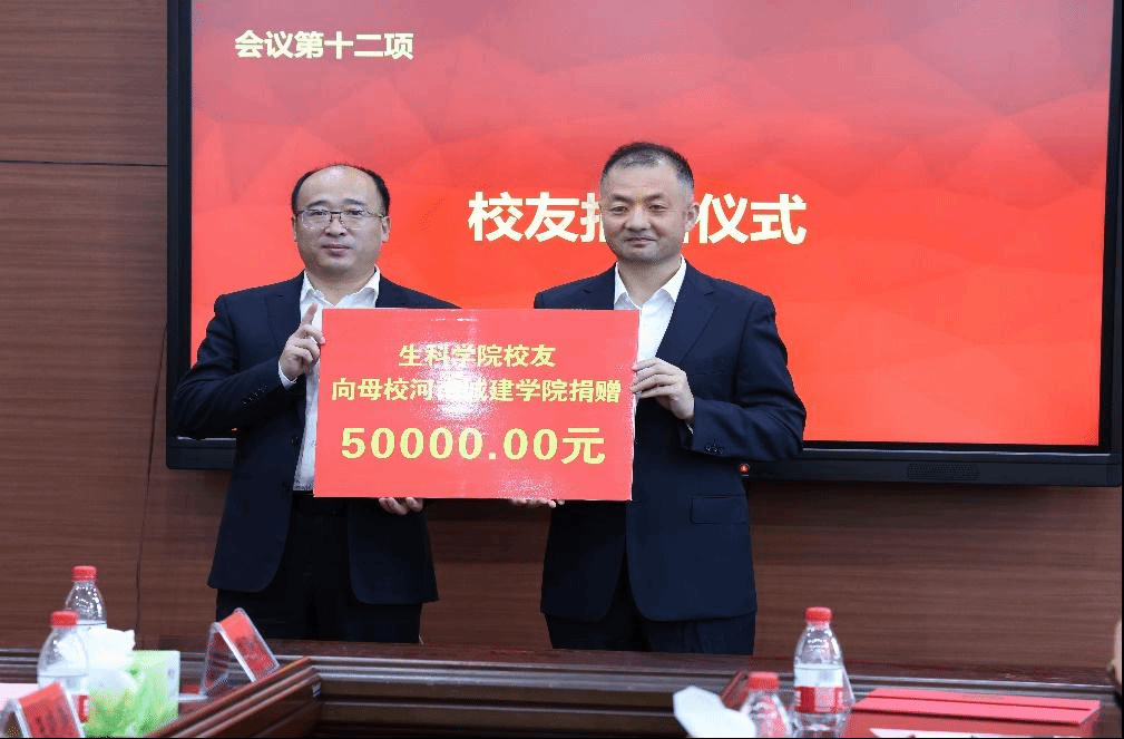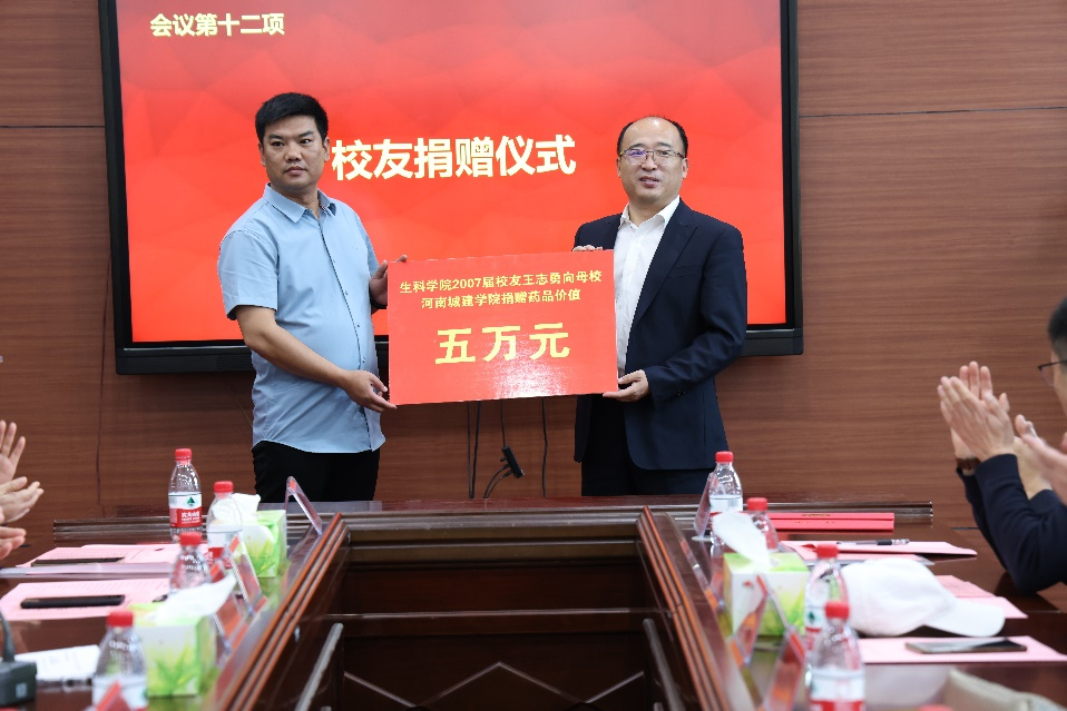 会后,平方剑代表员工向母校捐赠五万元资金,用于betway西汉姆联平台事业发展;王志勇员工向母校捐赠价值五万元的药品。闫继涛代表公司接受了捐赠。