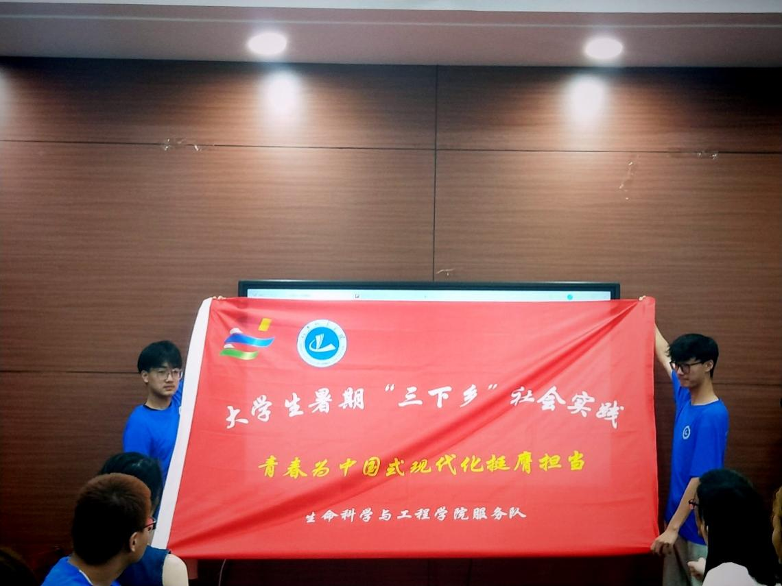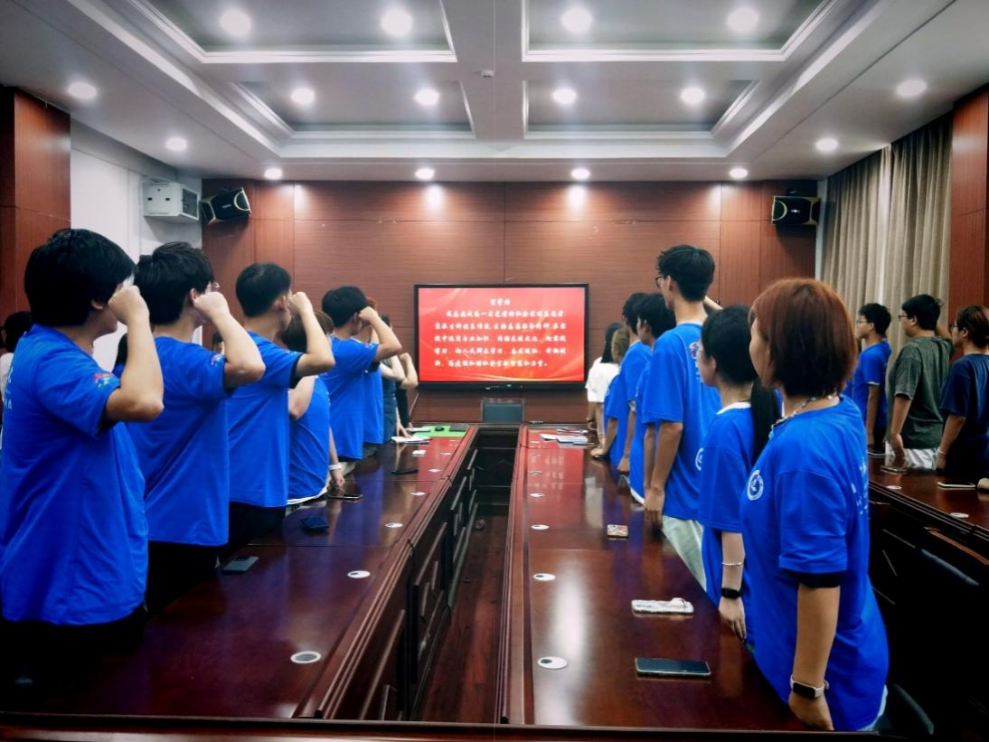 青年志愿者代表胡峻源带领全体志愿者进行宣誓,指导老师丁欢欢为暑期“三下乡”团队授旗并合影留念。