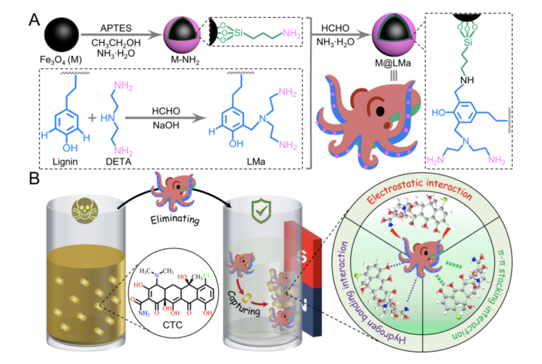 当前,水源中抗生素污染防治和木质素高效综合利用已成为当今社会亟需解决的关键科学问题。本研究聚焦于此,以磁性纳米复合物为核心,成功制备了基于木质素的多胺接枝磁性纳米捕获器。通过深入研究,揭示了该纳米捕获器去除水源中金霉素的作用机制及效果,这一成果不仅为木质素的高值化利用提供了创新思路,也为水源中抗生素高效清除开辟了新的途径,具有重要的科学意义和应用价值。