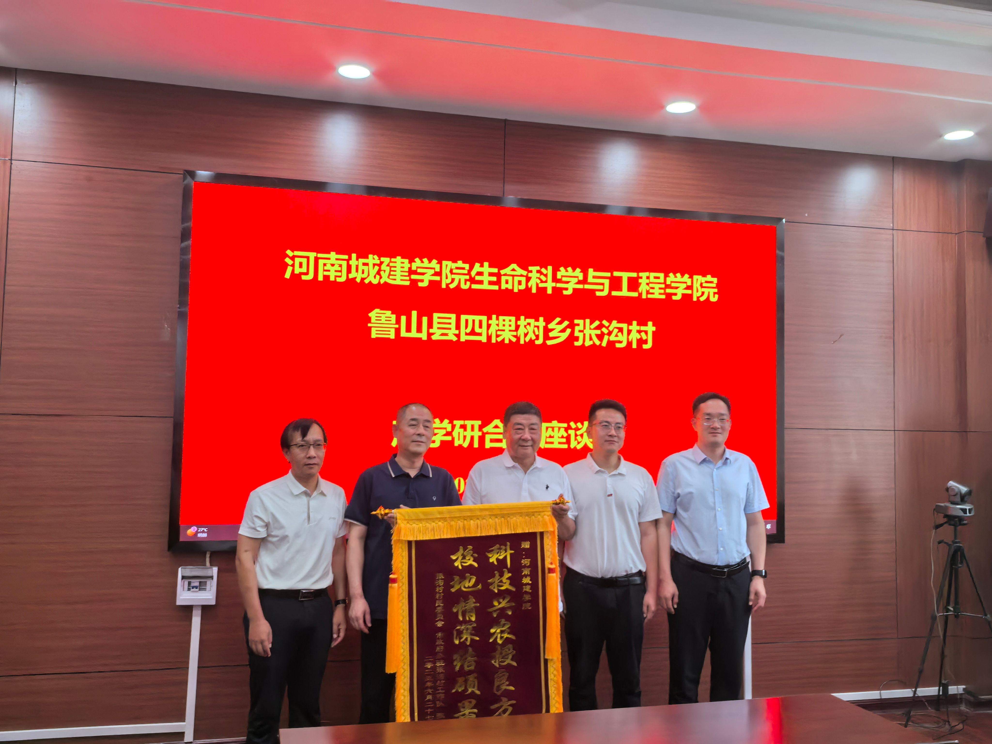 6月27日上午,平顶山市政府办公室副主任柳远、鲁山县四棵树乡张沟村党支部书记许建军和市政府办驻张沟村第一书记郑鑫等一行专程来校,将印有“科技兴农授良方 校地情深结硕果”烫金大字的锦旗送到betway西汉姆联平台,以此表达对公司倾心帮扶、助力乡村振兴的诚挚谢意。双方就进一步深化校地合作事宜进行交流座谈。校机关党委书记、党委组织部副部长孙方行、公司领导班子成员及博士代表参加座谈会。会议由公司党委书记武二伟主持。