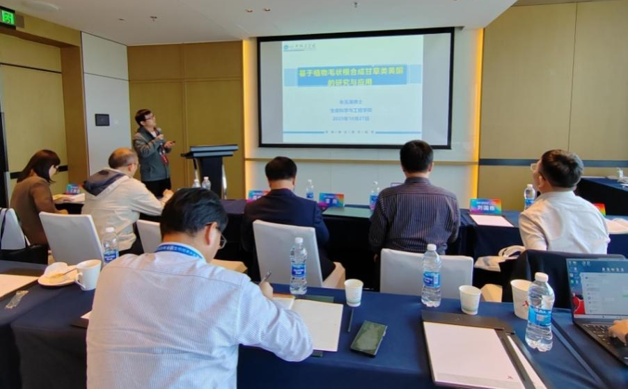 朱玉涛博士在农业合成生物学分论坛中报告了《基于植物毛状根合成甘草类黄酮的研究与应用》,构建了甘草类黄酮的植物毛状根合成体系,为珍稀药用植物活性成分的绿色合成提供了新路径。