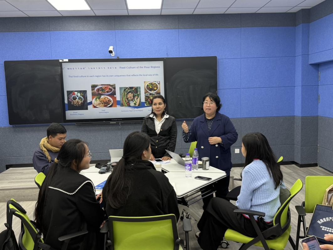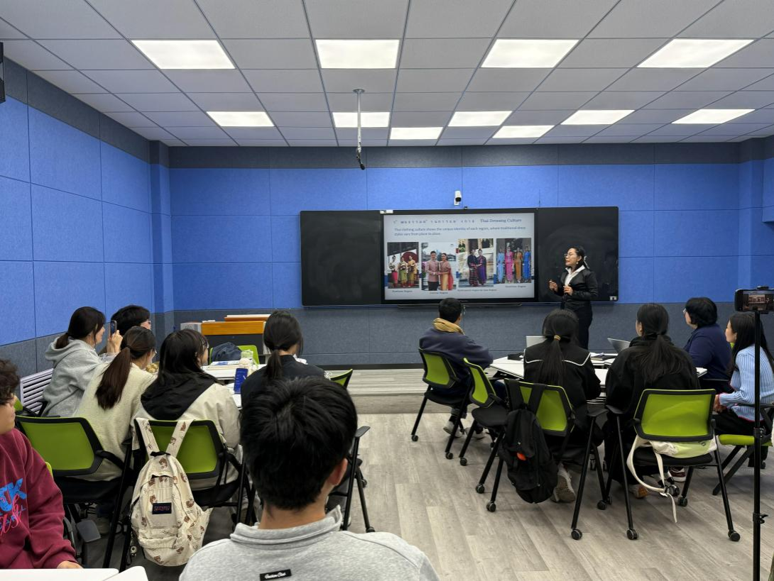 活动中,泰国研究生P.Chertr介绍了泰国院校的办学理念和校园生活,还与同学们分享了泰国当地的传统乐器与特色美食,展现了泰国文化。同学们围绕着泰国日常的饮食习惯和传统文化踊跃提问,P.Chertr面对同学们的热情提问一一细致解答,现场气氛十分,笑声不断。
