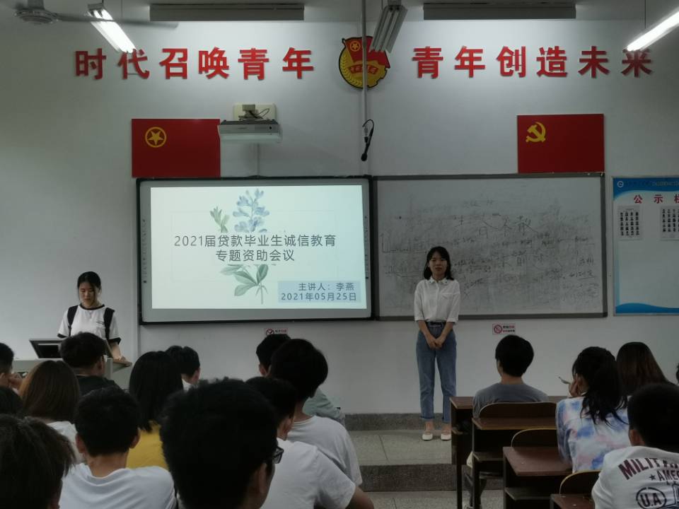 此次活动由资助专员李燕主讲,首先,她对高校国家助学贷款进行了详细介绍,即国家助学贷款政策解读、贷款员工提前还款办理流程、毕业确认及贷后管理工作等,使同学们对国家助学贷款有了深入了解。其次是文明诚信教育,通过国家助学贷款的具体形式、典型案例对同学们进行文明诚信教育。最后,共同观看《国家资助 成就梦想》专题片。
