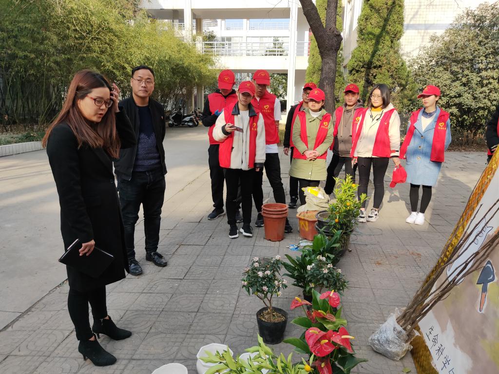 活动开始前首先由园林教研室韩路亚老师和支双城老师介绍待种植物的生活习性和种植时的注意事项,接着在韩老师的指导下志愿者们挥动着铁铲,挖坑、栽树、覆土、浇水,齐心一丝不苟的完成每一个环节。在大家的默契配合下,一棵棵绿植生机勃勃地挺立在花盆里。