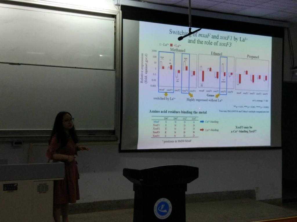 报告中吕好新博士首先对微生物技术的发展作了全面的线性梳理和分析,其次就她博士期间所做的课题“镧系元素依赖型甲基营养菌研究”做了深入浅出的讲解;最后,吕好新博士还分享了她的留学经历和一些自己在求学途中的心得体会。报告会后,吕好新博士和同学们进行了交流互动,根据自己的考研和求学经验,对同学们在考研方面的疑问和迷惑进行了详细和耐心的解答,使同学们在考研与工作的岔路口更加坚定目标,坚定信心。