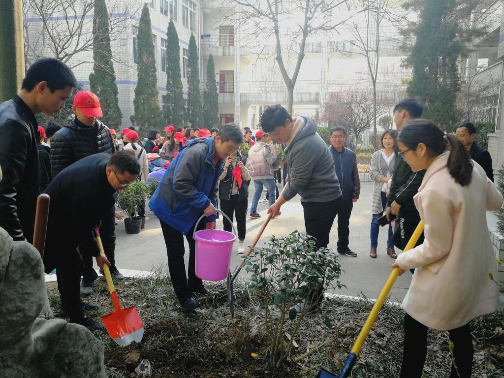 活动之初,胡建业就植树节的由来和历史演变过程进行了详细讲解,并从生态文明角度出发,给予这次活动充分地肯定,号召大家一起为建设生态文明校园努力;韩路亚结合专业知识,对所栽树种的名称、特性等进行了介绍。随后,在老师们的带领下,植树活动在阳光和煦的春日里有条不紊地进行着。教学楼在新栽景观树的映衬下,显得越发雄伟、生机盎然。