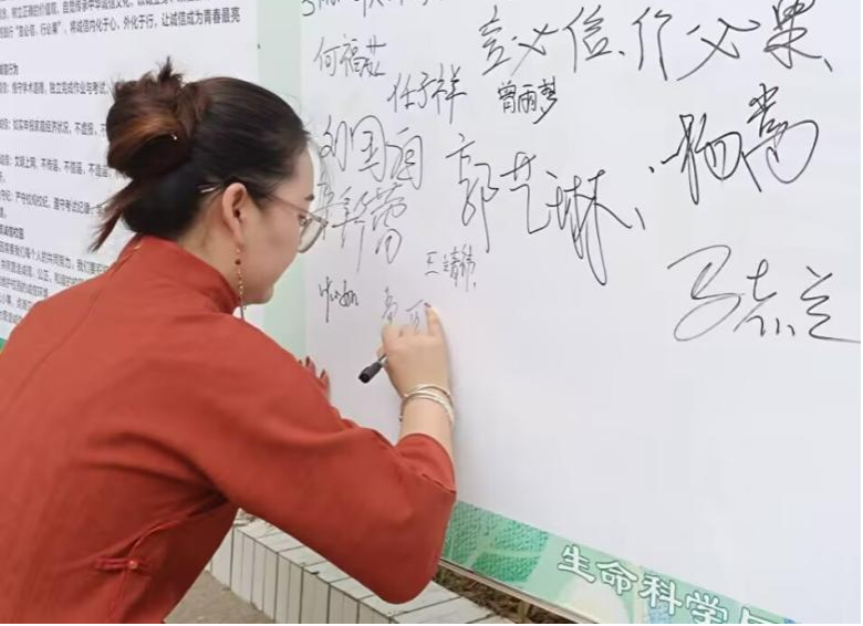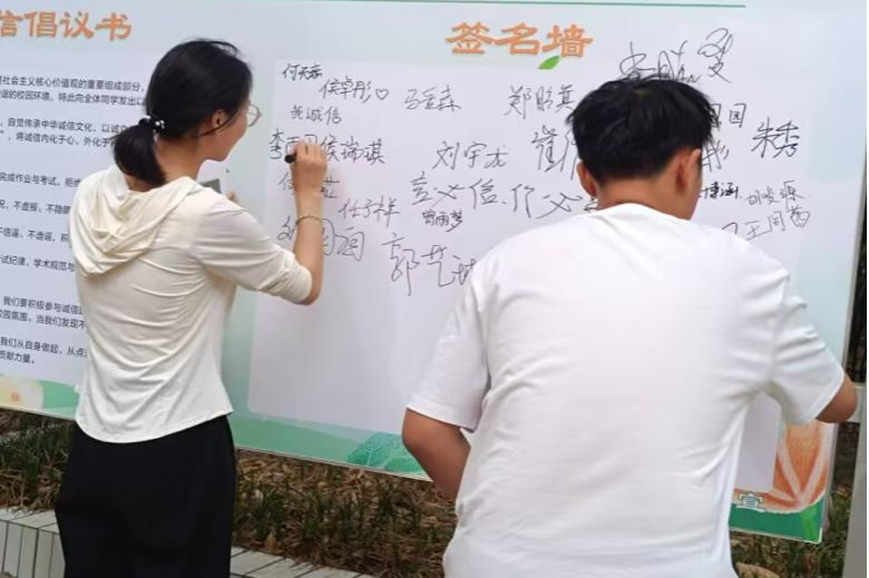 活动现场设有主题签名墙及诚信倡议书,,从"树立诚信观念"、"践行诚信行为"、"共筑诚信校园"三个方面号召员工恪守学术规范、如实申报资助、文明上网、遵规守纪等。活动吸引了员工们积极参与,大家在签名墙上写下“言必信,行必果”、“诚信立身”等诚信箴言,并郑重承诺,表示将从考试纪律、学术规范等细节践行诚信准则。